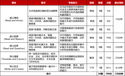 笔译赛项:赛题包括习近平新时代中国特色社会主义思想关键术语和中华思想文化术语翻译及阐释若干道、英译汉1篇、汉译英1篇,赛题构成见表2。