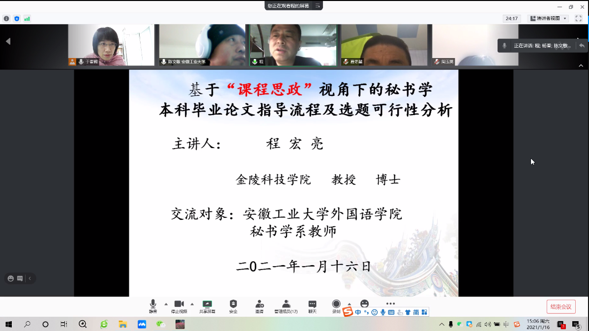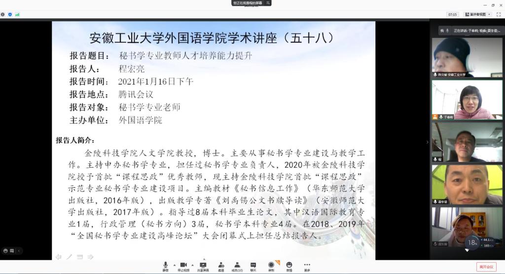 1月16日下午3点,伟德国际bevictor1946采用腾讯网络视频会议的方式,邀请了金陵科技学院秘书学专业学科带头人程宏亮教授,面向秘书学专业教师,举行了一场以“秘书学专业教师人才培养能力提升”为主题的学术讲座。会议由伟德国际bevictor1946陈琳副院长主持,全体秘书学专业教师聆听讲座并和程教授展开了详细的交流。