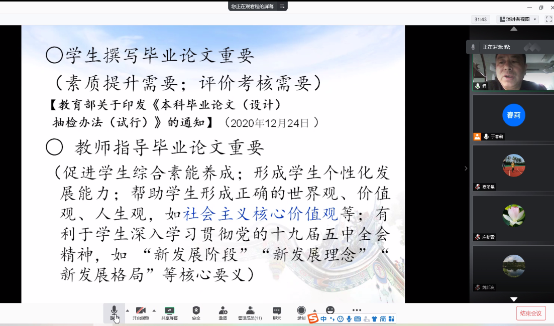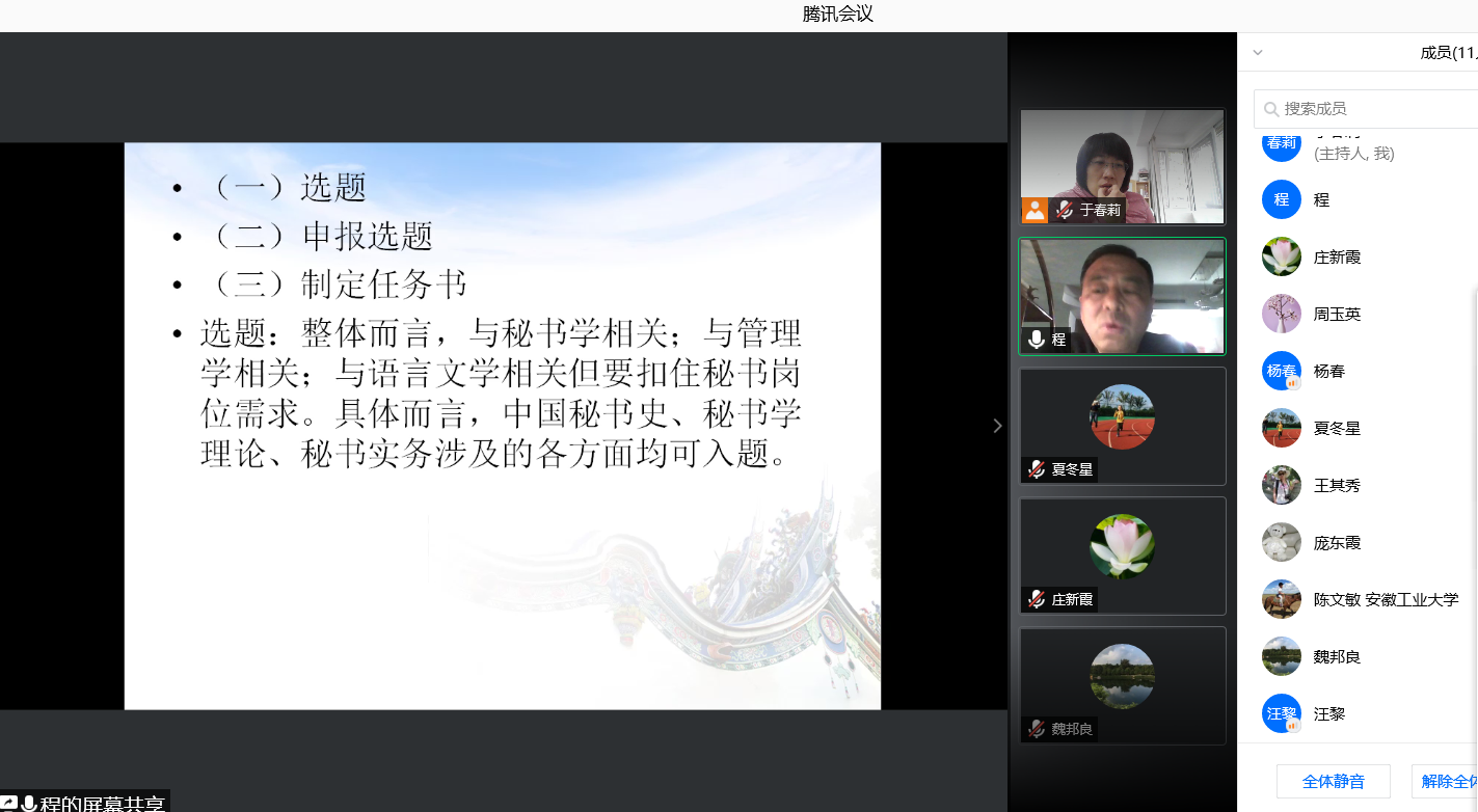 秘书学专业毕业论文的指导是秘书学专业教师人才培养能力提升的关键环节,程教授从“基于课程思政视角下的秘书学本科毕业论文指导流程及选题可行性分析”这一子课题出发,从毕业论文指导的价值与意义、毕业论文指导流程、学生选题评点等三方面为老师们进行了细致的剖析。其中,关于指导流程,程教授尤其详细地分析了秘书学专业学生常见的选题类型,并结合自己具体的指导经验进行了案例剖析。在学生选题评点方面,程教授详细地评价、分析了目前每位秘书学专业指导老师所带学生的题目的可行性,并分别给予了明确的修改建议。最后,老师们和程教授进行了热烈的线上交流、讨论,预定时长为两个小时的线上会议持续了将近三个小时,老师们仍感意犹未尽。