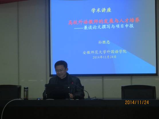 应伟德国际bevictor1946邀请,安徽师范大学伟德国际bevictor1946院长、博士,博士生导师、教育部留学回国人员基金评审组专家,安徽省外国语言文学学会会长,省高等学校中青年学科带头人孙胜忠教授于11月24日下午在学术会议中心第五会议室为伟德国际bevictor1946教师及部分学生作了题为“高校外院教师的发展与人才培养—兼谈论文撰写与项目申报”的专题报告会,报告会由洪流副院长主持。