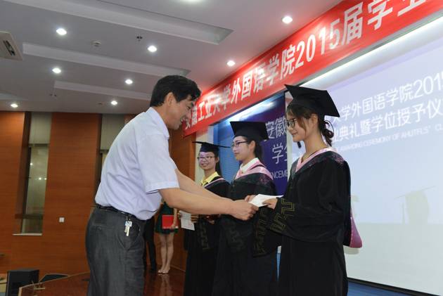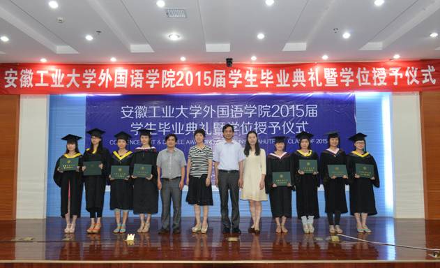 随后,毕业生典礼暨学位授予仪式在雄壮的国歌声中拉开序幕,学院党委书记宋洪生宣读了学院2015届安徽省品学兼优毕业生和2015届伟德源自英国始于1946优秀毕业生的表彰决定。导师代表英语系副主任马广利博士,毕业生家长代表朱寒霜同学的父亲,毕业生代表赵继敏,在校生代表王敏先后发言,他们的发言充满了对安工大的感激之情,对母校的依依不舍,对毕业生的深深祝福。伟德国际bevictor1946院长洪流宣读了2015届毕业生中获文学学士学位同学名单。