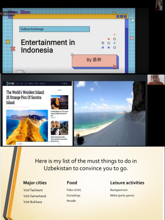 第一批课堂交流活动中,Syahra、Robert和Ali三位留学生首先就话题分别进行时长约10分钟的汇报演讲:Syahra从印尼的国家概况入手,介绍了印尼的地理位置、人口、旅游景点等,接着她结合视频重点分享了印尼最有特色的三种舞蹈:Kecak、Wayang和Prambanan Ballet Dance,十分生动有趣。来自乌兹别克斯坦的Robert就“娱乐”主题,从自己国家和文化背景具体介绍乌兹别克斯坦的旅游景点,特色食物,以及当地人的两种休闲方式,即Backgammon(棋类)和Mafia(类似于狼人杀的游戏)。Ali来自也门,他先简要介绍自己的国家,然后图文并茂着重介绍也门的主要节日,包括国家节日、国际节日、宗教节日等三种类别。