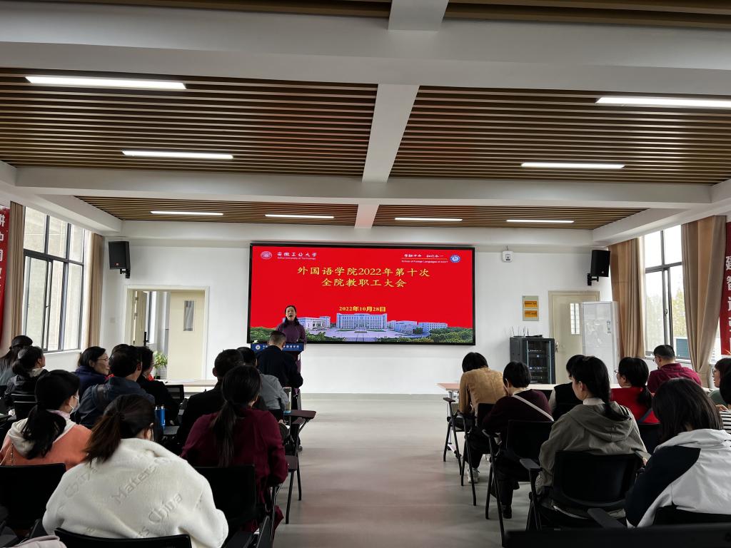 党委副书记、院长曹瑞斓通报布置了学院教学、科研和社会服务等工作。她指出,在党的二十大胜利召开之际,在党和国家对教育、科技和人才以及推动中华文化更好走向世界的工作部署中,全院教职工要坚持为党育人、为国育才,加强课程思政,推进三进教学工作,在已有工作成果基础上,继续深化和拓展服务学校学科建设的校本特色大学英语教学改革,加强以国家级一流专业建设为契机的英语类专业建设,做优语言文学学科建设、硕士学位点建设和高水平人才培养,更加紧密地与地方政企联系并投身语言服务产业事业建设,坚定信心、同心同德,埋头苦干、奋勇前进。