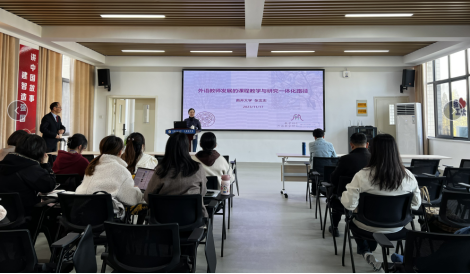 张教授基于自身多年的教学以及科研经验,循循渐进展开了报告。他首先阐述了“教学科研一体化”的相关背景,然后从“外语教师发展的课程教学与研究的一体化发展路径实践”角度出发,结合自身实践的研究成果,提出了外语教师发展不仅是教师自身的内在需求,也是国家教育高质量发展需求,教师既是自身发展的需求方,也是主要供给方。最后从“赋权增能型英语教学团队的一体化发展路径实践”探讨了几个实现“一体化发展”的实施路径。