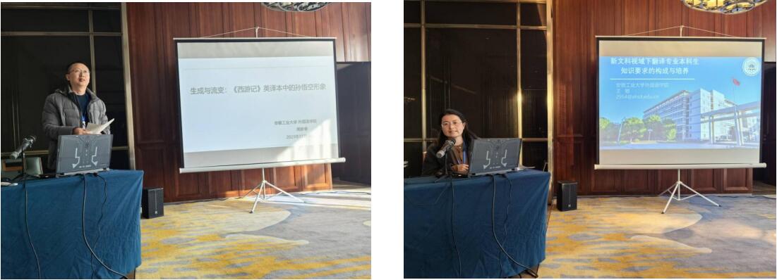 11月18日,在翻译分论坛上,我院教师周家春以“生变与流变:《西游记》英译本中的孙悟空形象”为主题,分享了自己对于文学翻译的探索;王敏老师围绕“新文科视域下翻译专业本科生知识要求的构成与培养”进行了专题发言,参会的4名研究生围绕“经典文学作品的翻译”进行了汇报。在大学英语分论坛上,副院长陈琳就“一流专业建设背景下理工类高校英语专业课程设置与课程教学调查——基于全国‘理工类高校英语一流专业建设研究与实践’学生问卷”展开了深入探讨,余卉老师围绕“新文科背景下‘文文融合’的路径探索——以外语学与历史学为例”进行了汇报。