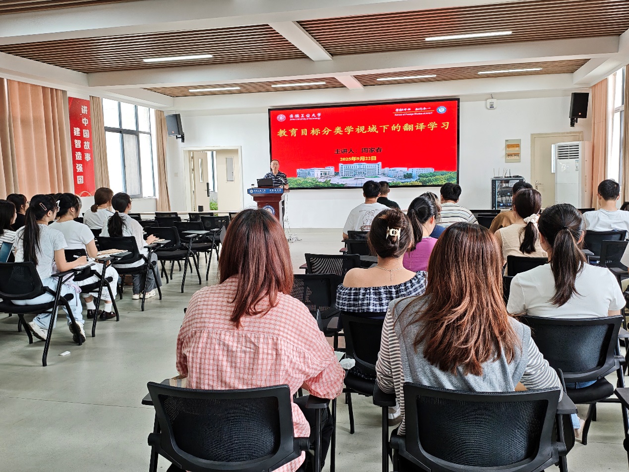 讲座伊始,周家春以布鲁姆六个层次的认知过程理论为依据,详细介绍了六个认知过程维度(记忆、理解、应用、分析、评价、创造)和四个知识维度(事实性知识、概念性知识、程序性知识、元认知知识)的具体涵义,并借助高水平论文和鲜明案例总结出目标分类在翻译学习中的应用:信达切。最后,周老师以电影名称的译文、旅游景点标语的译文等时代素材为例,与现场老师学生进行了交流讨论。