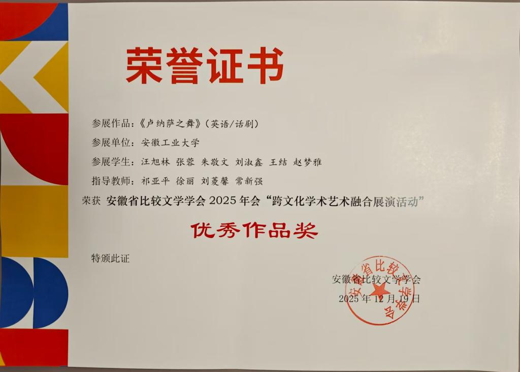 2025年12月19-21日,安徽省第五届比较文学学会年会在黄山学院举办。上海外语教育出版社协办此次年会,并成功举办了“跨文化学术艺术融合展演”“跨文化能力提升工作坊“等特色活动。伟德国际bevictor1946《李尔王》与《卢纳萨之舞》剧组受邀参加“跨文化学术艺术融合展演”活动,并获优秀作品奖。