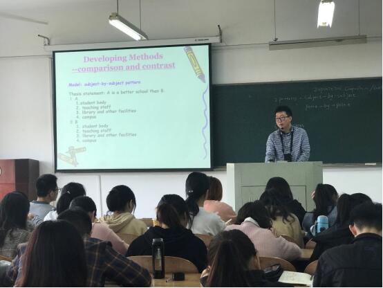唐侃老师在课堂上首先通过大量实例,讲解英语写作方法中的“比较”与“对比”手法的运用,梳理能够体现比较和对比的连接词和短语,并强调比较与对比使用中应当遵循的各项原则。临近结束,学生上台展示自己的作文习作,唐老师为学生进行了点评。课后,唐老师与各位听课的老师积极交流,听取老师们的意见建议。部分听课老师将听课意见和建议及时反馈,与唐老师一起讨论教学方法。最后达成共识:老师的角色是导演,需要课前明确每节课上课目标,想方设法合理设计课堂教学各个环节,最大限度扩大学生参与度,让自己的课堂真正互动起来,让学生在亲身实践中掌握知识拓展技能。