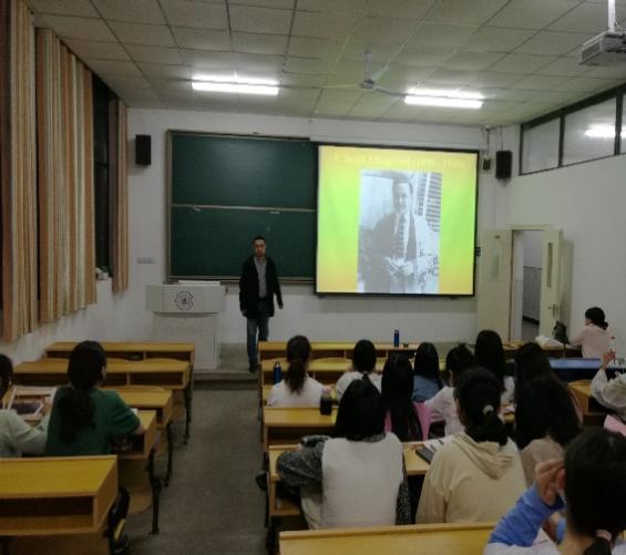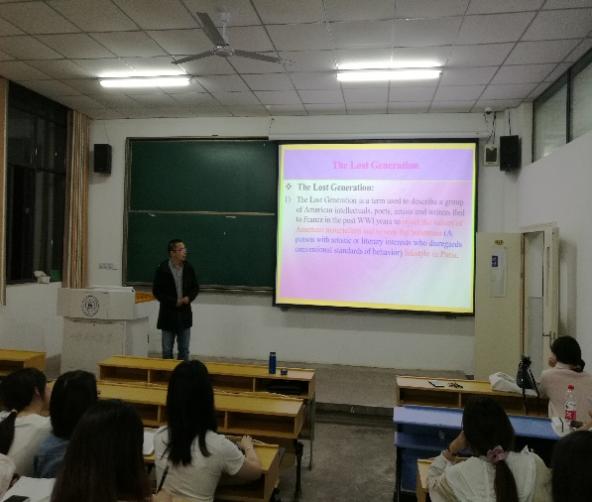 5月17日晚在教一107教室,伟德国际bevictor1946外语系主任、马广利博士走进课外阅读实训课堂,作了一场关于美国20世纪最杰出的作家之一菲茨杰拉德的代表作----《了不起的盖茨比》小说赏析的专题讲座,实训指导老师蒯振华和汤红老师以及19级翻译专业全体同学聆听了马博士的精彩讲座。