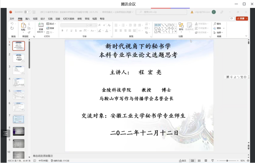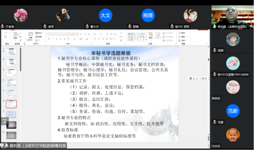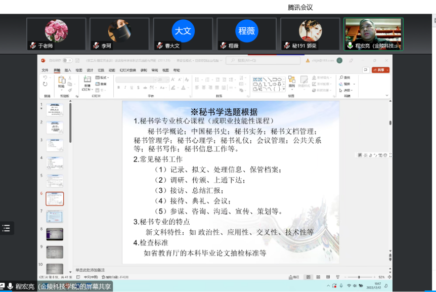 12月12日晚7点,伟德国际bevictor1946采用腾讯网络视频会议的方式,邀请了金陵科技学院秘书学专业学科带头人程宏亮教授,面向秘书学专业教师和学生,举行了一场以“新时代视角下的秘书学本科专业毕业论文选题思考”为主题的讲座。会议由于春莉老师主持,秘书学专业教师和全体学生聆听讲座并和程教授展开了详细的交流。