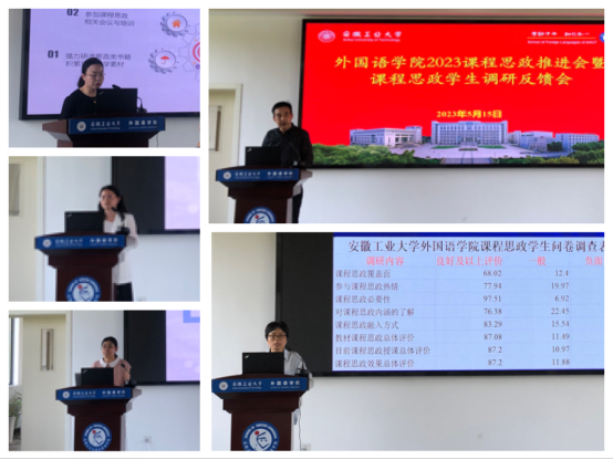 会议由四项议题组成,分别是:1.二外法语课程思政建设情况汇报,汇报教师为外语系法语教师吉玉婷;2.课程思政视域下大学英语“智慧课堂”建设:理念与实践,汇报教师为大外一部王敏;3.了解世界文化,讲好中国故事——《大学提高英语》课程思政实践,汇报教师为大外一部贾冬梅;4.外语系课程思政学生调研反馈,汇报教师为副院长陈琳。