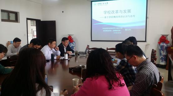4月29日下午,伟德国际bevictor1946在学院会议室召开2016年第二次党委中心组学习(扩大)会,传达校人才工作会议精神,学习校综合改革实施方案精神,研讨学院“十三五”发展规划。校发展规划处(高教研究所)戴玉纯处长应邀作《学校改革与发展—基于供给侧改革的认识与思考》的专题辅导报告,院党委委员,学院各系部主任、副主任,各党支部书记参加了学习。院党委书记胡卫东主持了学习会。