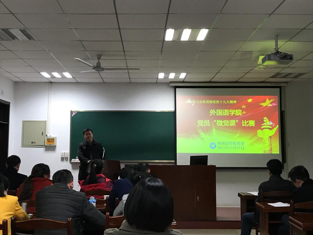 为深入学习宣传贯彻党的十九大精神,丰富党员政治理论学习形式,促进理论学习效果与教学能力的双提升,实现以赛促学,11月21日下午,伟德国际bevictor1946党委在秀山校区汇文楼C503开展了党员“微党课”竞赛观摩活动,学院6个党支部选拔的8位选手参加了比赛。校纪委副书记、纪委办主任、监察处处长王俊和院领导洪流、黄宇弦、曹瑞斓应邀担任评委,全体师生党员、系主任和各民主党派教师观摩了此次活动。学院党委书记胡卫东参与了“微党课”展示,洪流主持了比赛。