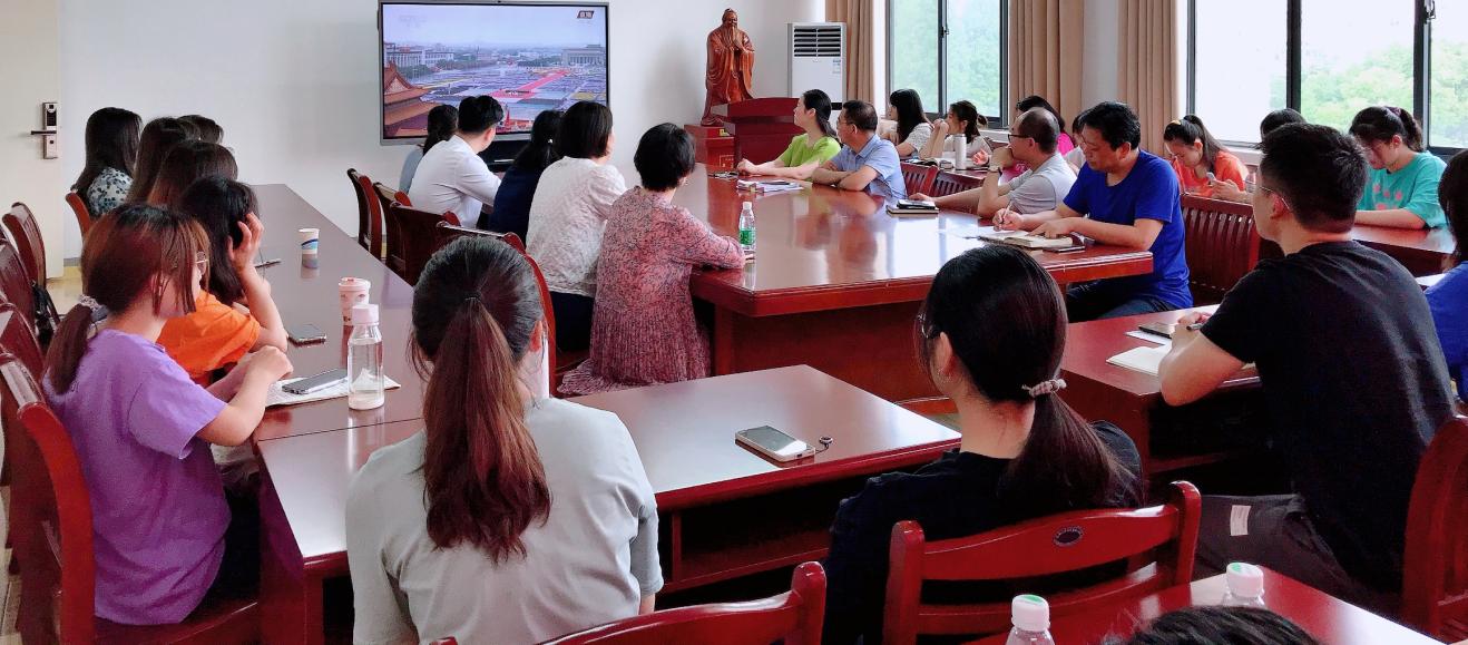 上午8:00,学院部分师生在佳山校区教一407会议室集中收看大会盛况。学院宣传标语都已点亮,营造热烈喜庆的气氛。