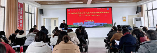 2月21日下午,开学第一天,伟德国际bevictor1946在佳山校区教一401多功能报告厅举办学习宣传贯彻党的十九届六中全会精神宣讲报告会,特邀请校党委讲师团成员、马克思主义学院李春雨老师来我院宣讲。学院全体教职工和部分学生代表参加会议,报告会由学院党委书记黄宇弦主持。