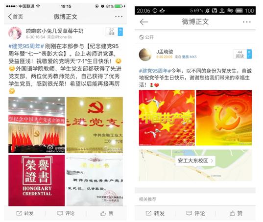 7月1日是中国共产党建党95周年,伟德国际bevictor1946学生党支部组织学生党员开展了“百年还有一个‘我’”系列活动。“我”为“五”谐音,寓意中国共产党百年大庆还需要我们每一名党员的不懈努力。继“我听—红歌里难言的深情”“我看—电影中鲜活的历史”“我写—笔杆下庄严的文字”“我敬—岁月中忠诚的老人”四项活动后,又开展了“我愿—年后璀璨的明天”微博祝福活动。学生党员们在“七·一”建党节前一天,在各自微博上参与了“建党95周年“话题讨论,发表了主题活动期间参与的系列活动留影,表达了对中国共产党的祝福,展现了自己作为党员为党奉献的决心。