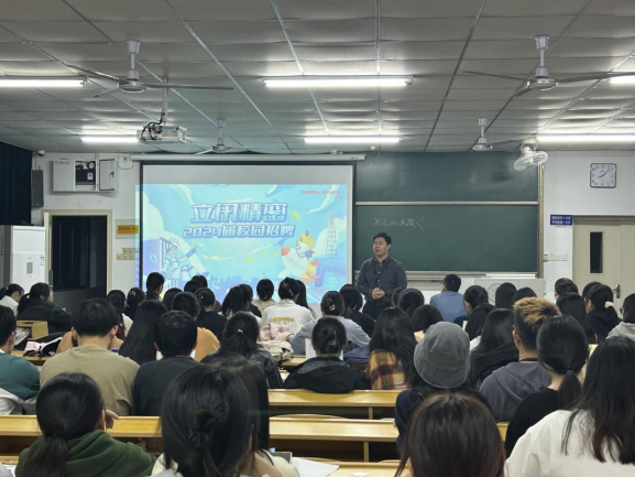 招聘会上,立讯精密工业股份有限公司华东区人事经理周培双代表招聘团队向同学们介绍了公司的发展情况、行业前景以及岗位需求。他们通过视频宣传、PPT介绍和现场答疑的方式,向同学们展示了公司的规章制度、福利待遇、企业文化、产业结构、组织构架以及人力资源政策等方面的情况,并就公司涉外项目管理类英语需求和工作岗位性质、内容进行了详细阐述。在互动环节,毕业生们就自己的专业方向及公司发展平台与机会等问题与招聘团队进行了交流互动。会后,毕业生积极向企业投递简历。
