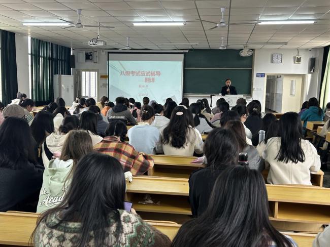全国英语专业八级考试在即,为了帮助同学们更好地掌握答题技巧,节约复习时间,提升考试通过率,伟德国际bevictor1946于3月28日下午在教一420举办“卓越教师论坛系列讲座”之英语专业八级考试翻译应试指导讲座,特邀蒯振华老师主讲,毕业班辅导员张美玲及2020级毕业生参会。