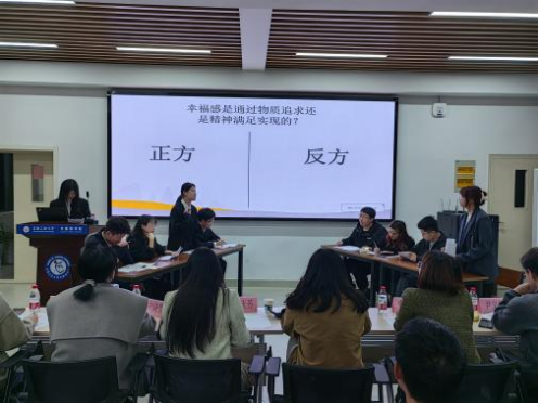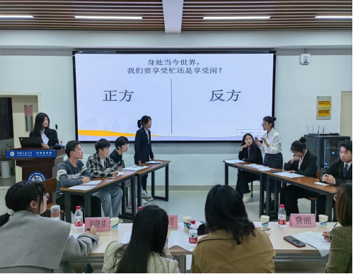 半决赛现场气氛紧张而热烈,选手们围绕“幸福感是通过物质追求还是精神满足实现的”、“身处当今世界,我们要享受闲还是享受忙”两个辩题展开激烈辩论。他们或引经据典,或举例论证,充分展示了各自对辩题的深刻理解和独到见解。观众也被选手们的精彩表现所吸引,不时发出阵阵掌声。经过激烈的角逐,两学院各有四名选手成功晋级决赛,他们在比赛中展现出了出色的团队协作能力和应变能力,无论是立论还是辩驳,都展现出了高水准的辩论技巧。