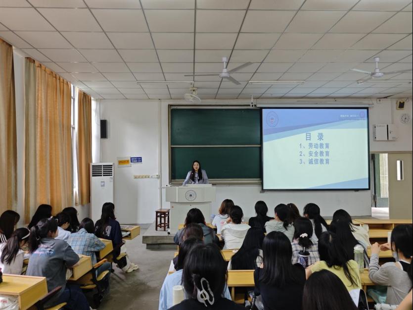 深入贯彻落实立德树人根本任务,加强学生教育管理,5月16日,伟德国际bevictor1946在教一117召开2023级期中年级会,会议围绕劳动教育、安全教育、诚信教育三大主题展开,并通报了4月份宿舍安全卫生检查结果,对优秀宿舍进行表彰。会议由2023级辅导员张庆芳主持,全体学生参会。