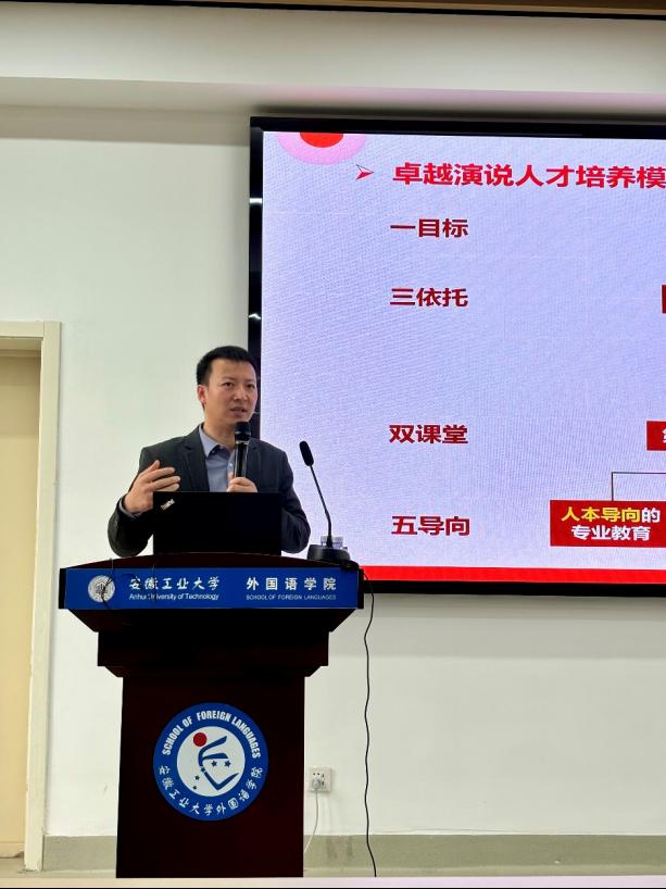 2024年4月11日下午,华东师范大学外语学院副院长、博士生导师赵朝永教授应邀来到伟德国际bevictor1946,在佳山校区第一教学楼401作了题为“以赛促学,产出导向,科技赋能:卓越演说人才培养模式探索”的学术讲座。讲座由伟德国际bevictor1946副院长陈琳教授主持,伟德国际bevictor1946教师、演讲俱乐部成员、其他学院感兴趣的师生100余人聆听了讲座。